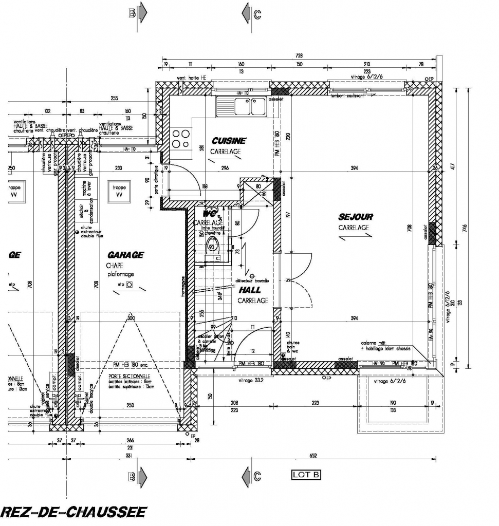RDC : un séjour, une cuisine ouverte, un garage pour une voiture, une chaufferie, un WC, un hall et une terrasse
