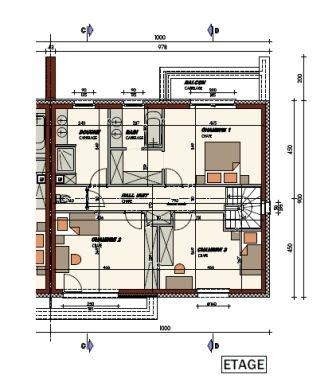 Etage +1 : un hall de nuit, 3 chambres à coucher, un balcon, une salle de douche, un WC et une salle de bains