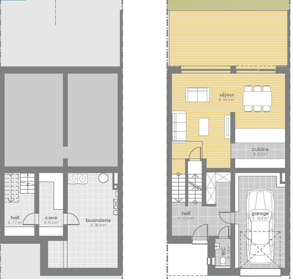 Rez-de-chaussée: un hall, un garage pour une voiture, une cuisine ouverte sur le salon-salle à manger et accès sur une terrasse arrière et un WC séparé