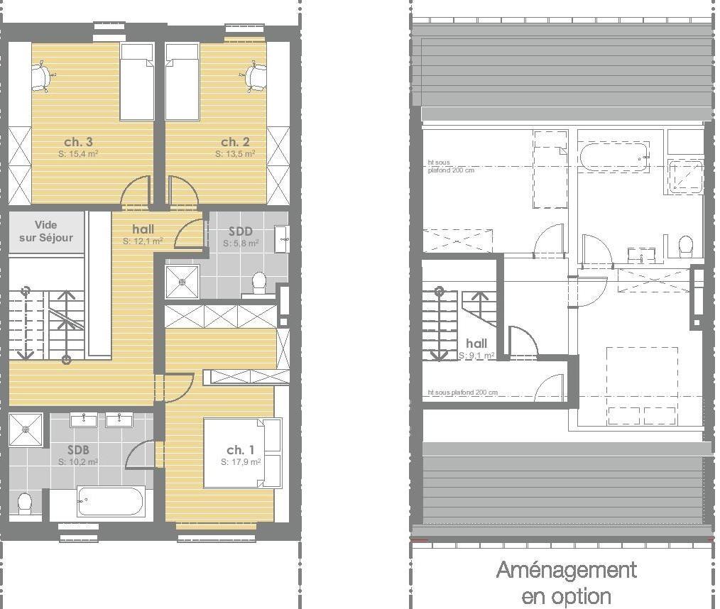 Les combles sont aménageables : EN OPTION : Possibilité de créer un hall de nuit, deux chambres à coucher et une salle de bains