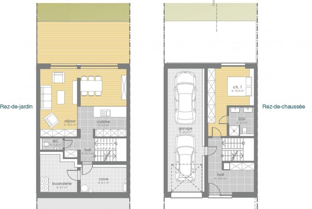 Rez-de-chaussée: un hall, un garage pour deux voitures, une chambre à coucher avec une salle de douche