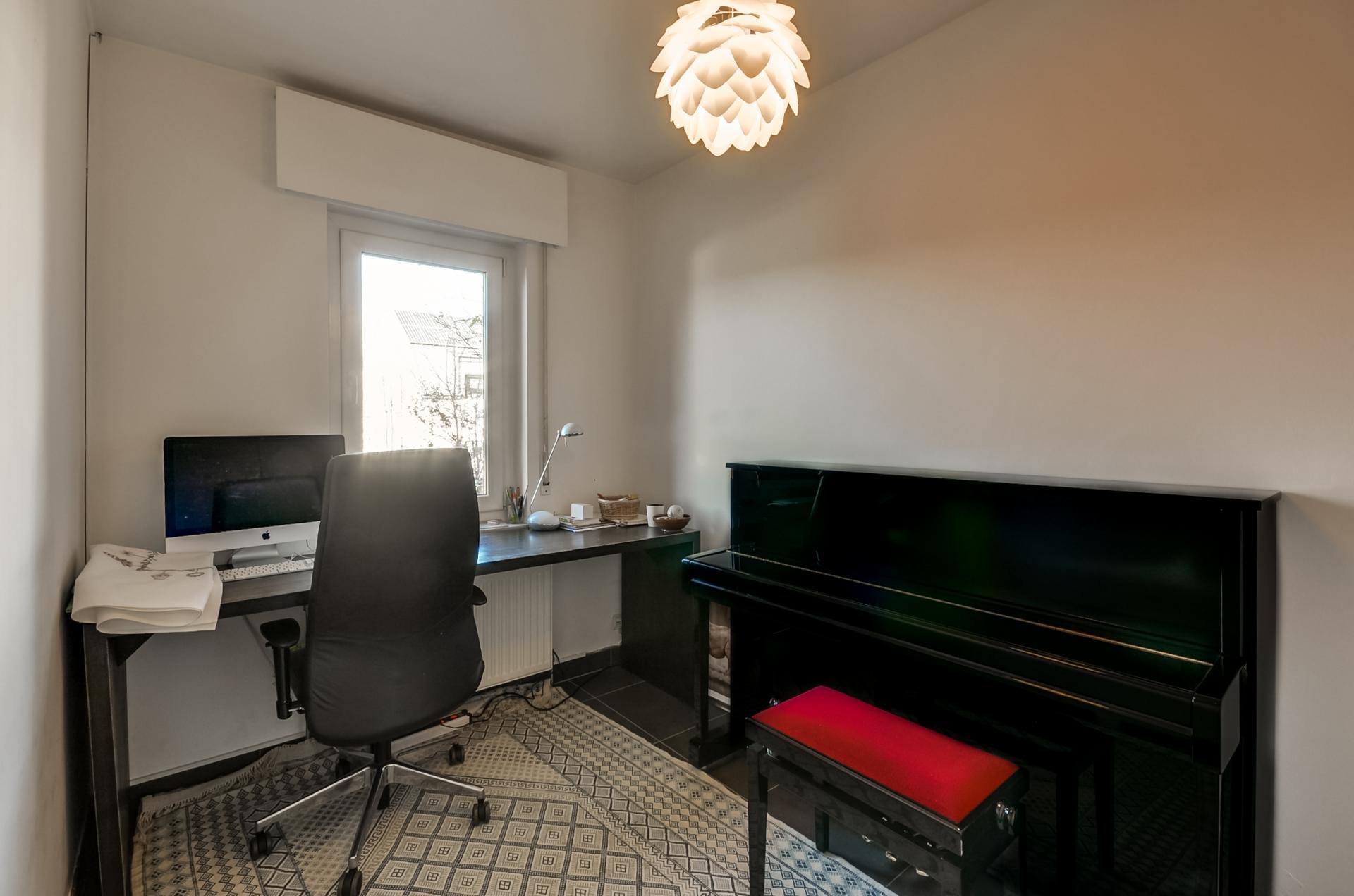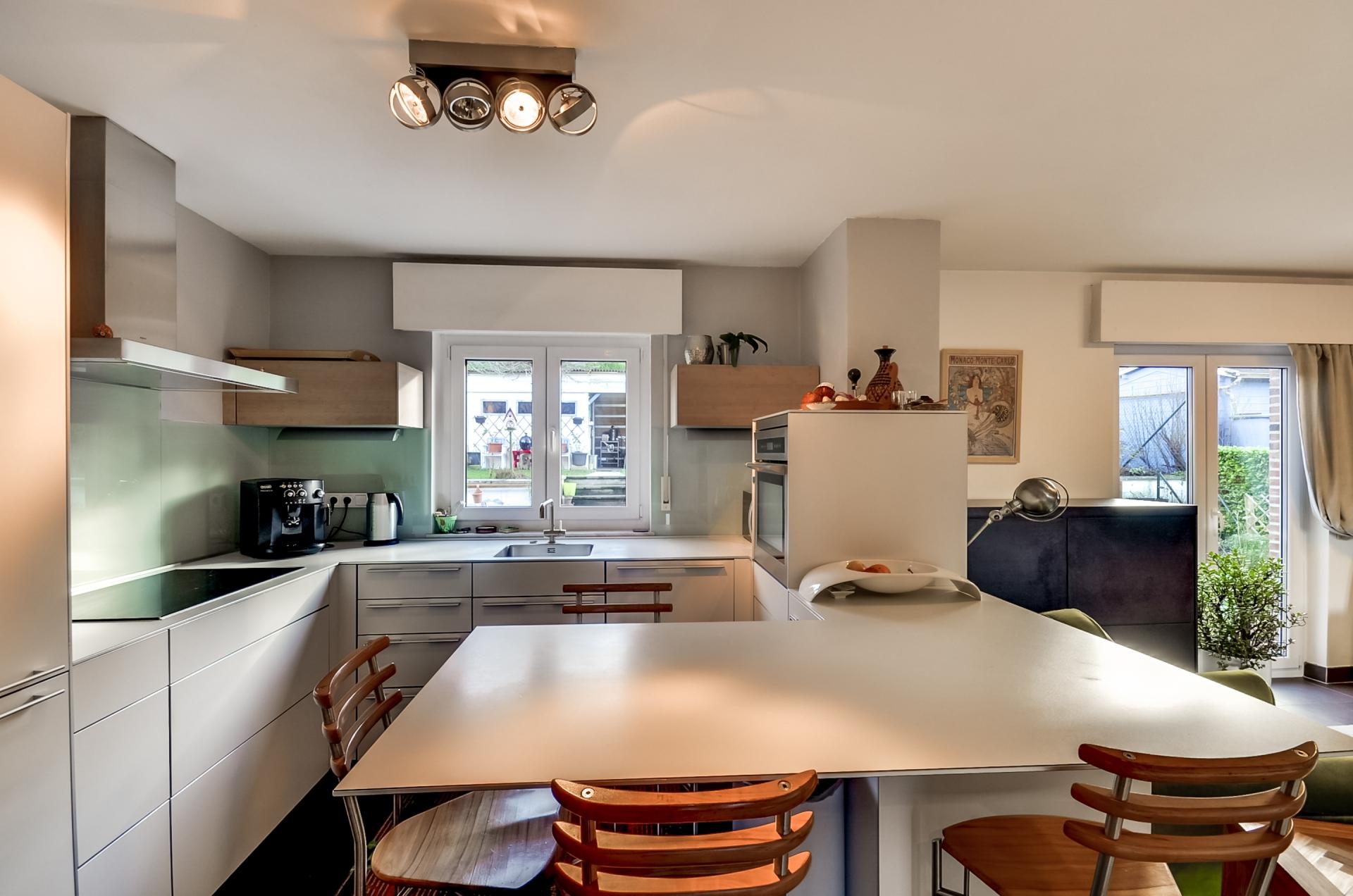 - Hall d'entrée. - WC séparé. - Vestaire - Petite chambre d'environ 8 m2 pouvant servir de büro, chambre bébé ou rangement. - Cuisine ouverte Bulthaupt sur salle à manger et le living avec accès à la terrasse et le jardin. - Feu ouvert. - Buanderie/rangement avec accès à la terrasse et le jardin. - Garage 1 voiture. - Car-port à côté de la maison.
