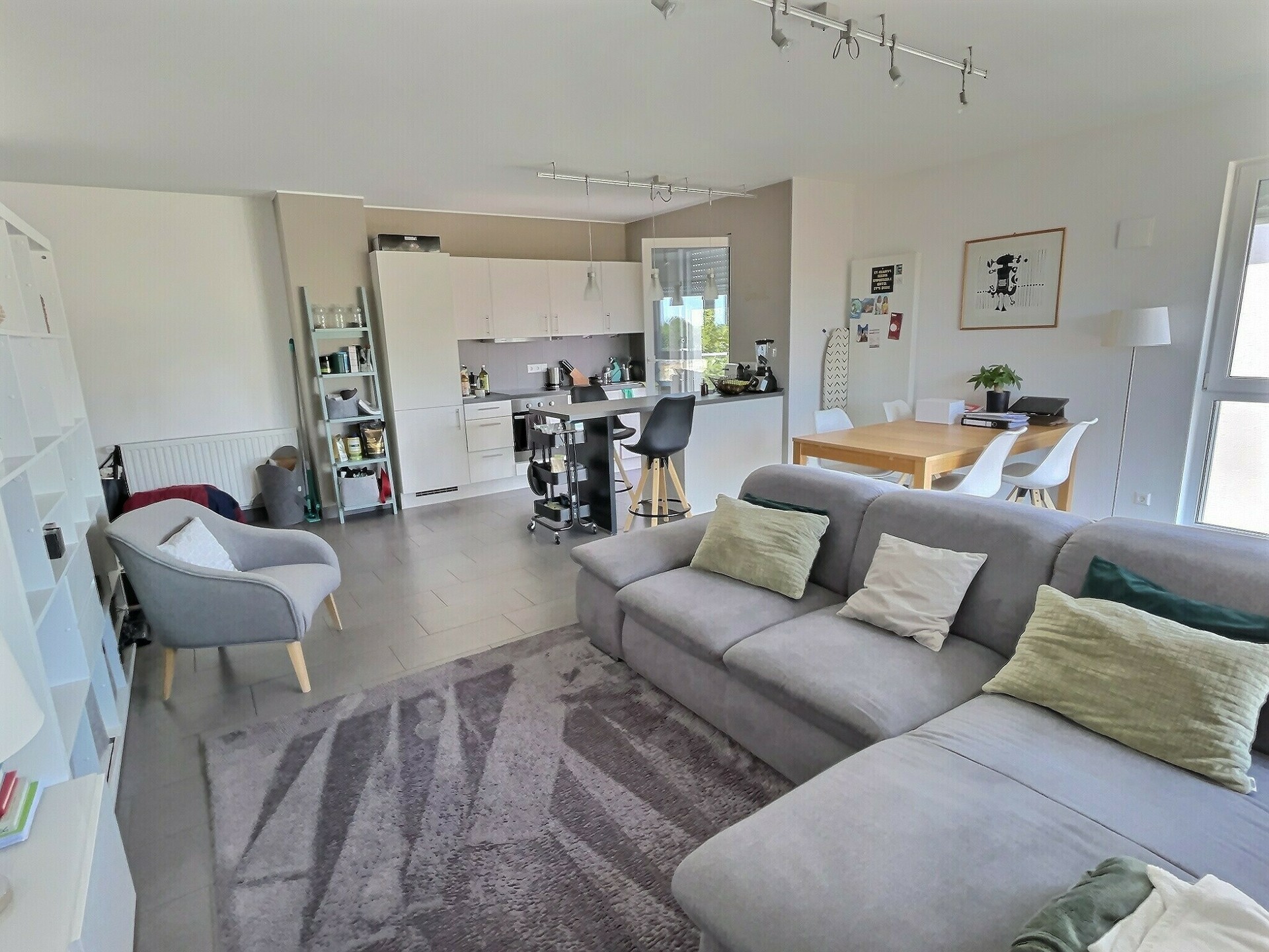 - Un espace de vie lumineux (+/-38m2) incluant une cuisine équipée, à l'américaine, et son balcon (+/-2,50m2)