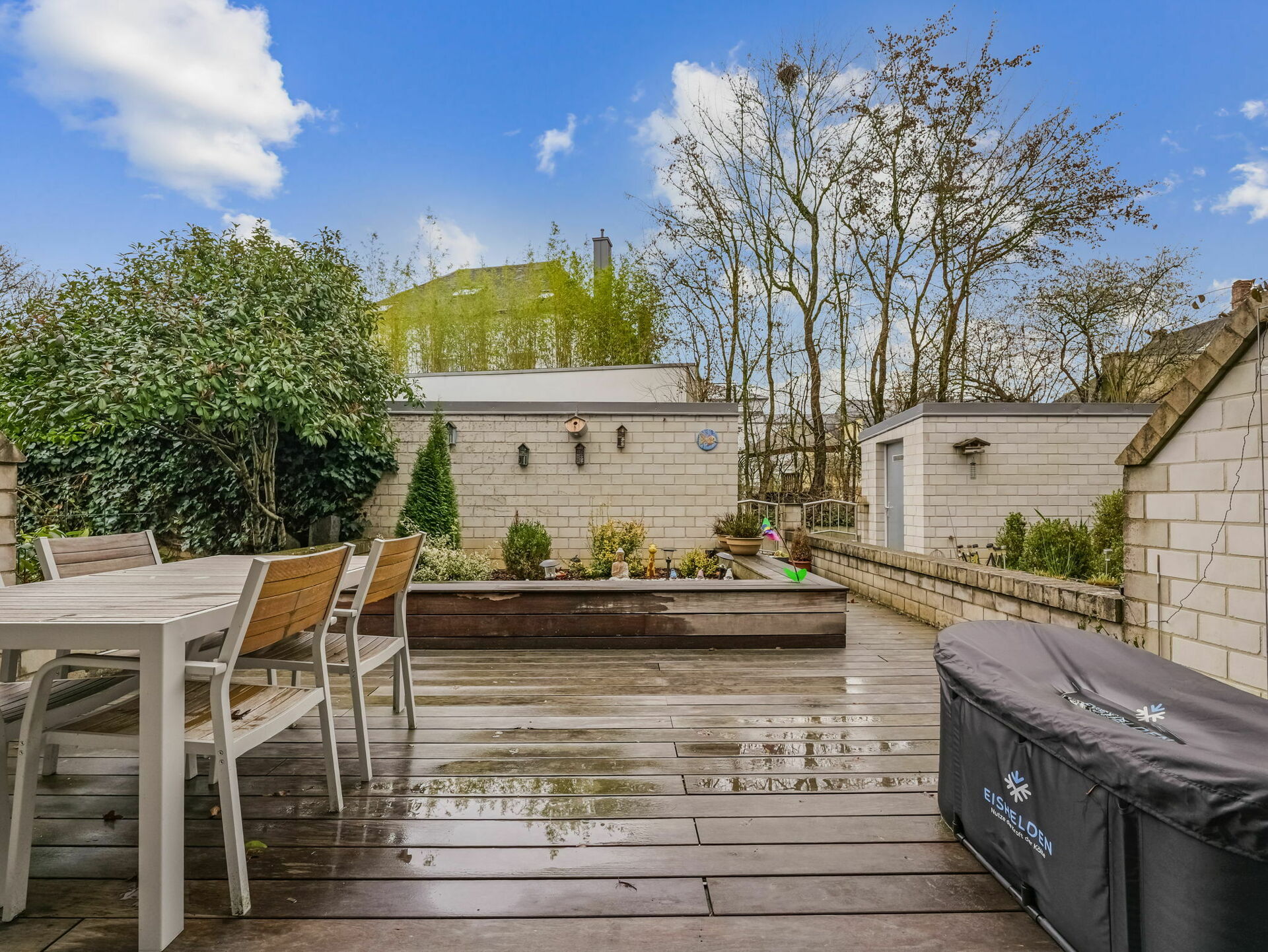 - Une grande salle de vie (33m2) donnant sur un jardin (+/-100m2) incluant une belle terrasse en bois (+/-30m2) et une cabane en briques (+/-6,50m2) au fond du jardin (pour stocker outils de jardinage, barbecue et vélos). En effet une sortie est disponible sur le fond du jardin