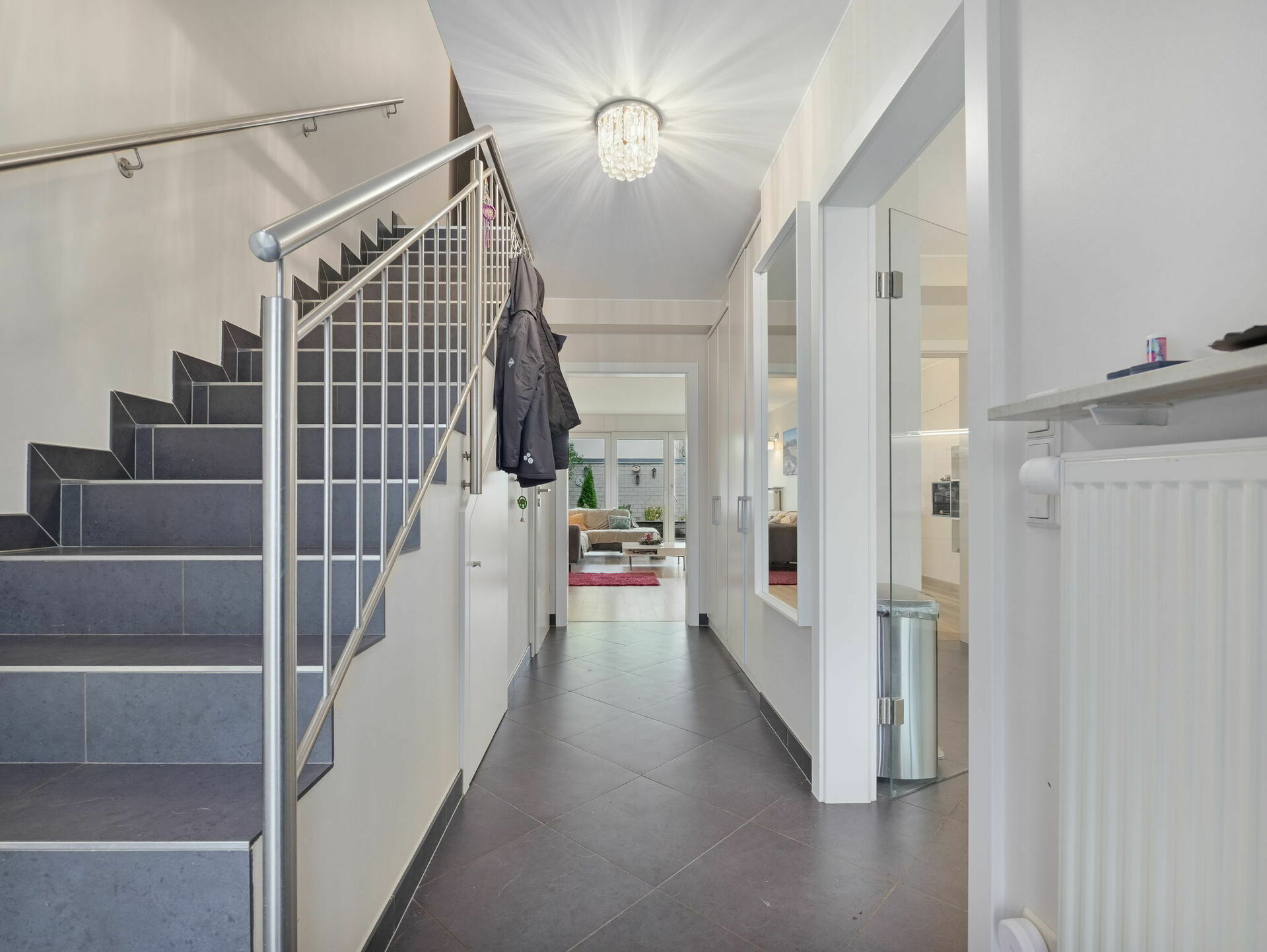 - Un hall d'entrée (+/-7m2) desservant les pièces de l'étage et l'accès à l'escalier montant à l'étage supérieur