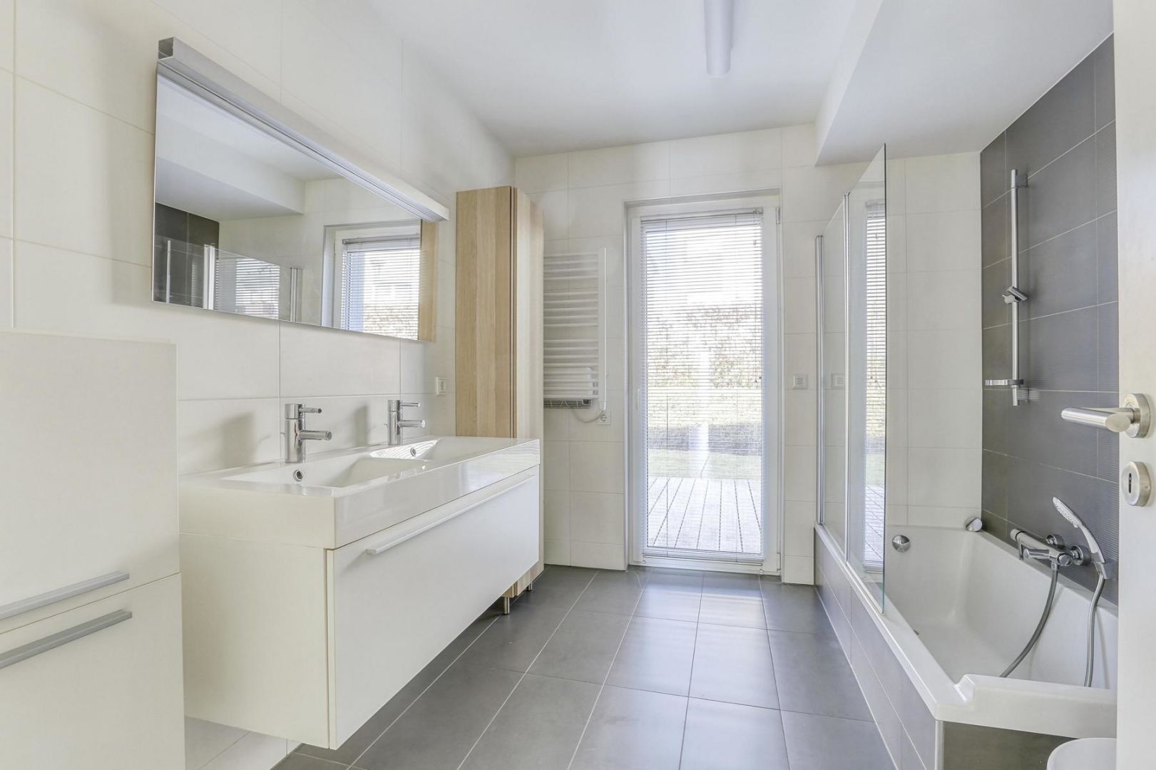 - Une salle de bain de +/-7,50m2 avec porte-fenêtre donnant également sur la terrasse, à l'arrière de l'immeuble