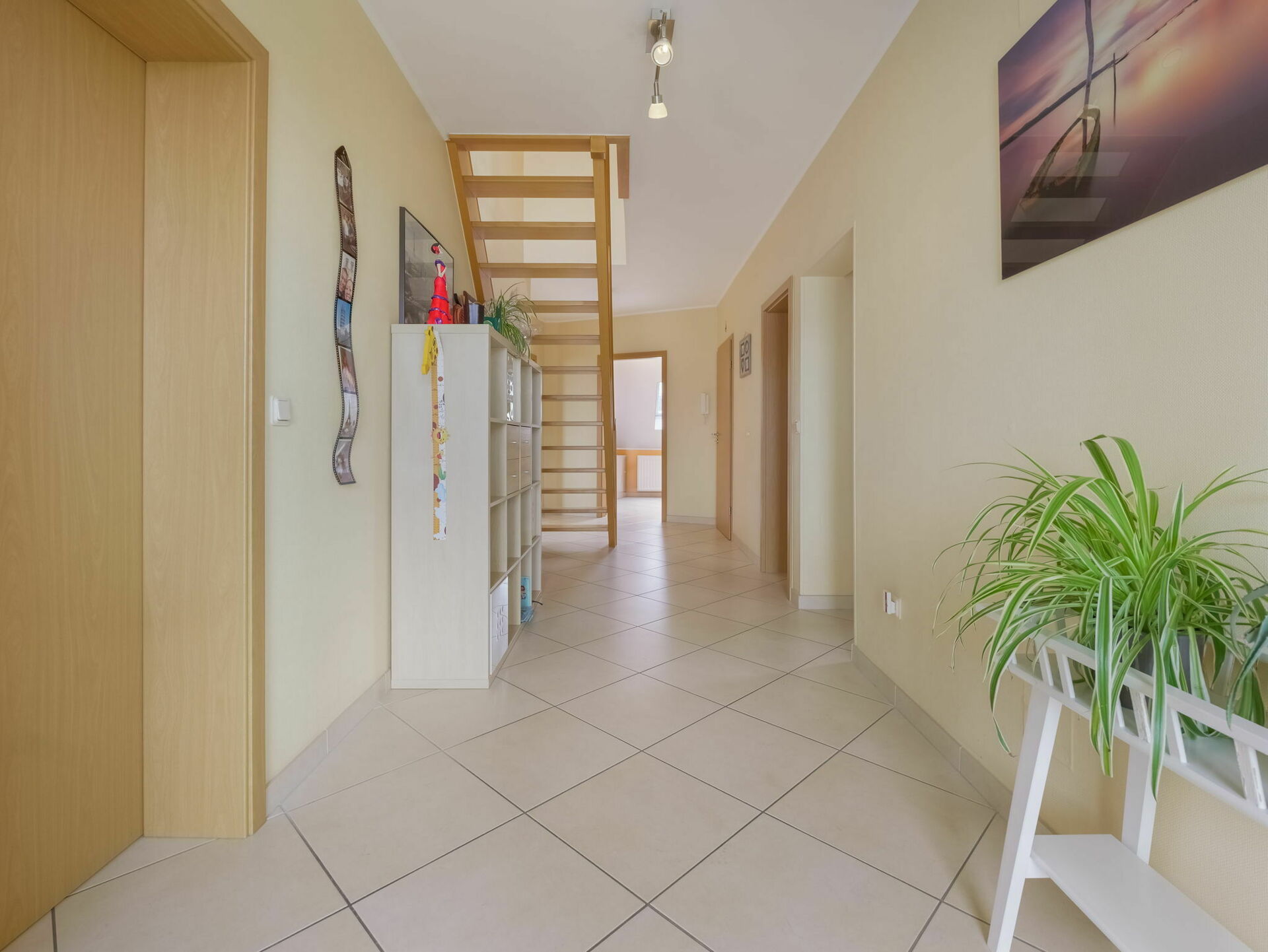 - Un hall d'entrée et un couloir desservant (+/-16,50m2) les pièces de l'étage et l'accès à l'escalier montant à l'étage supérieur