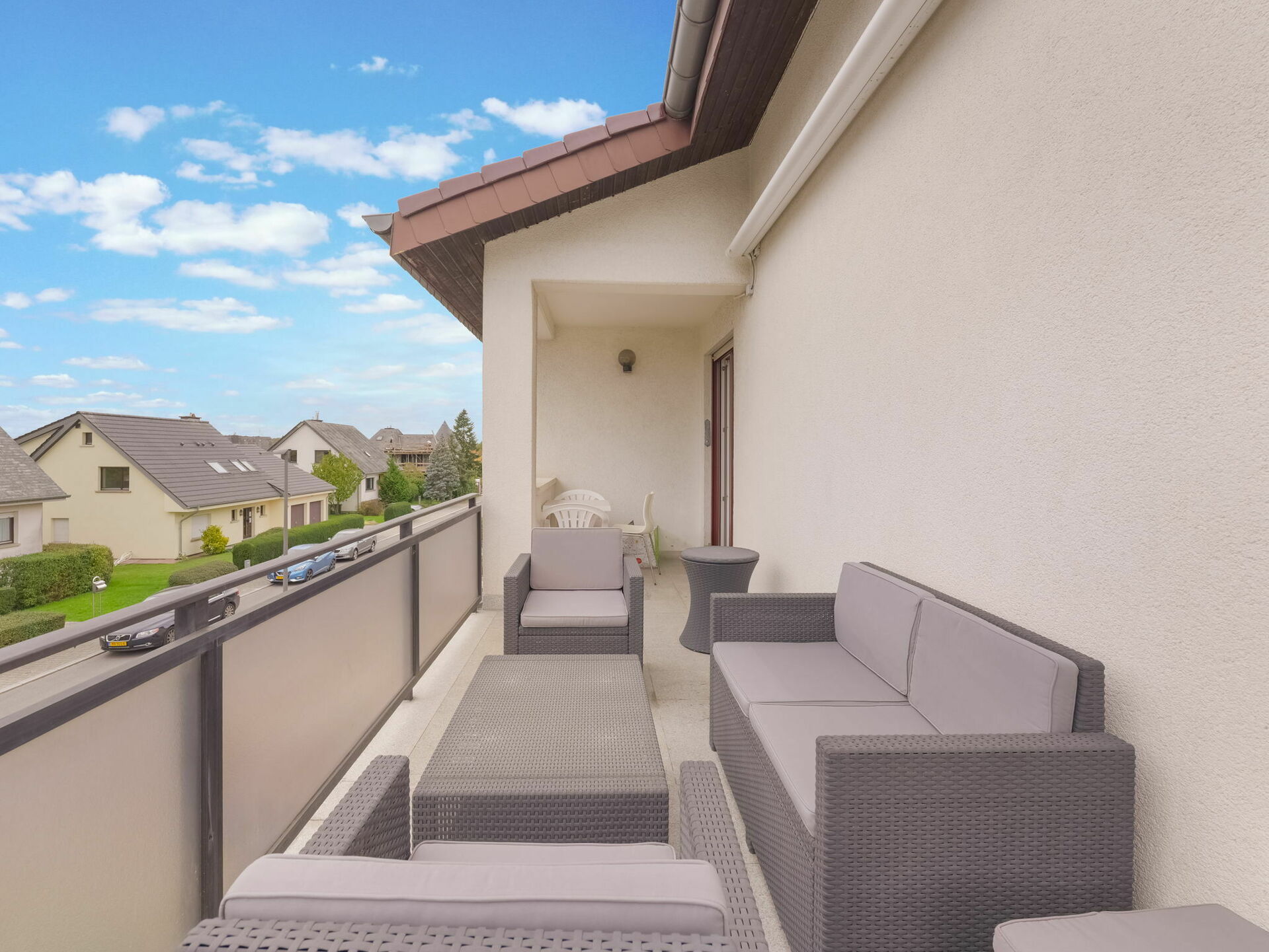 - Accès à un grand balcon (+/-14m2) au fond du couloir