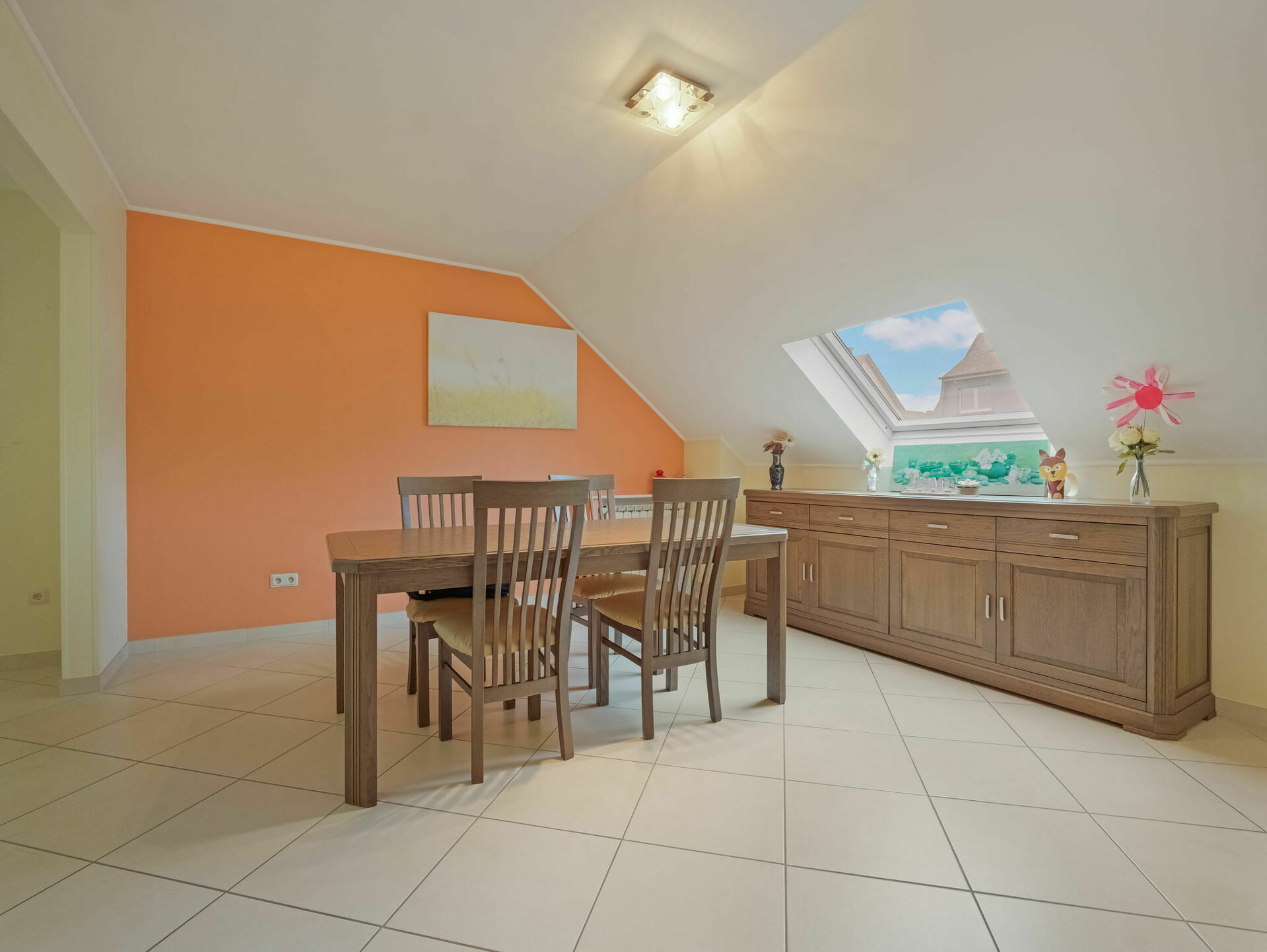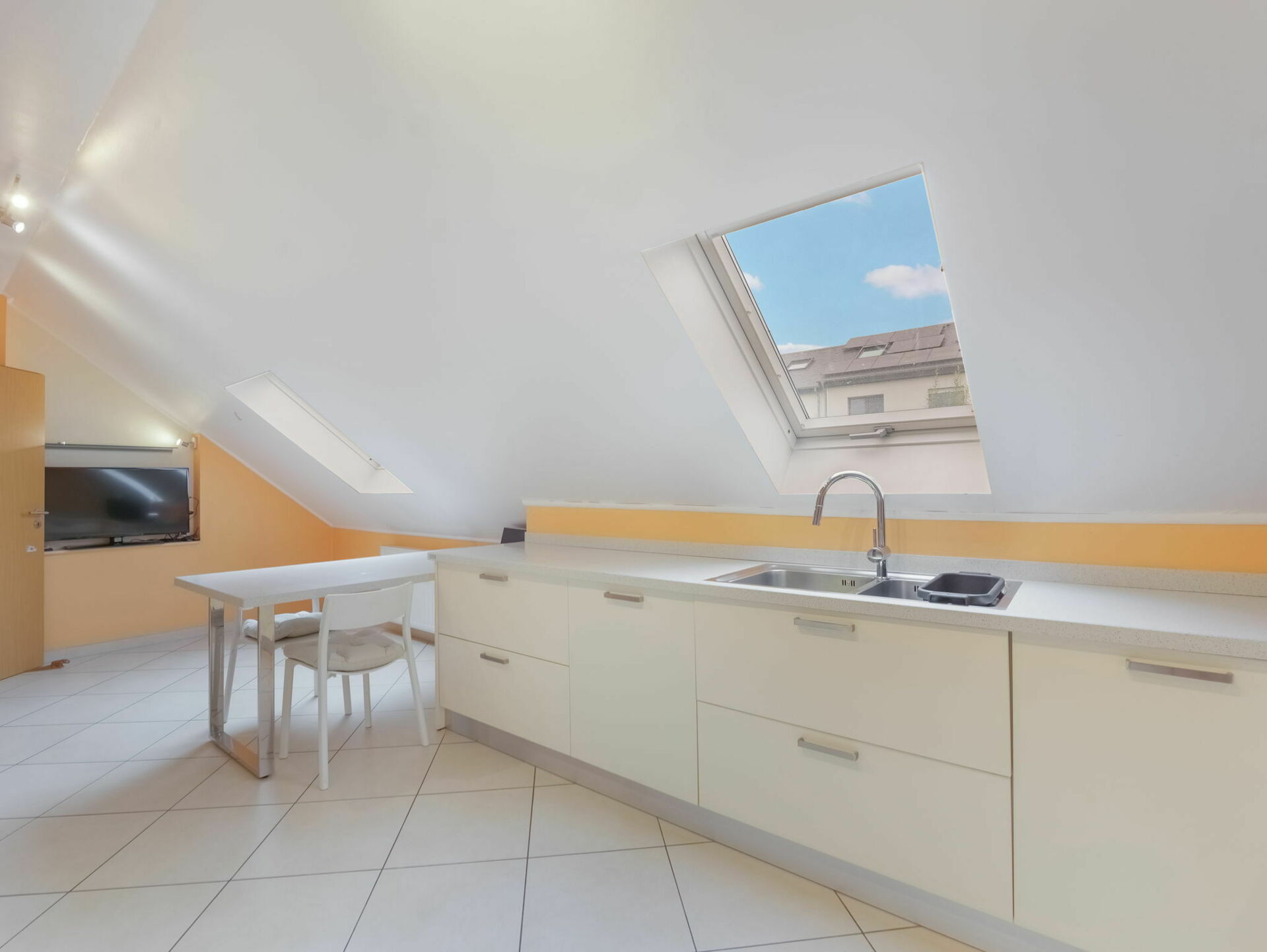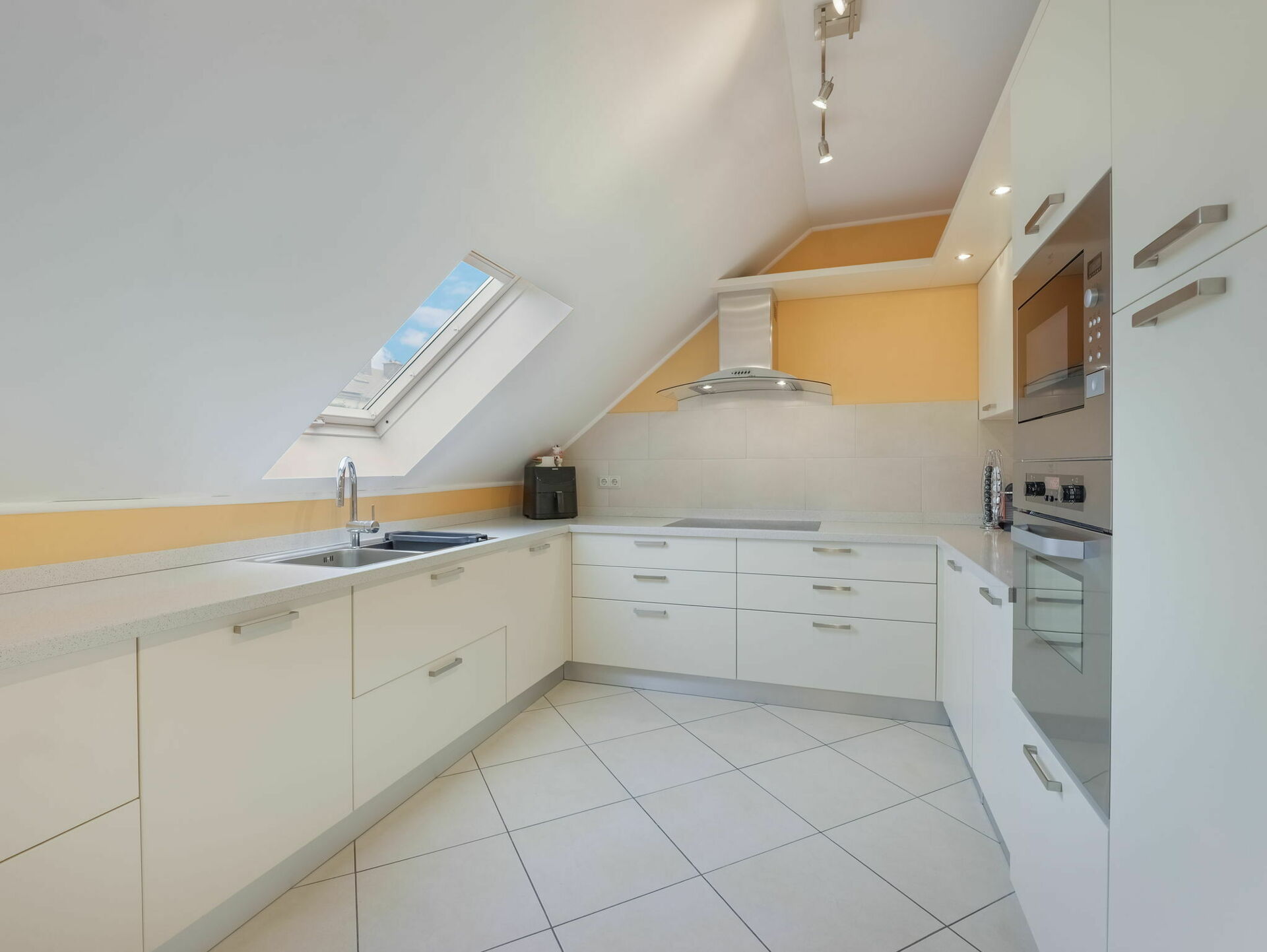 - Une cuisine équipée et fonctionnelle mansardée de +/-14m2 (+/-23m2 au sol)