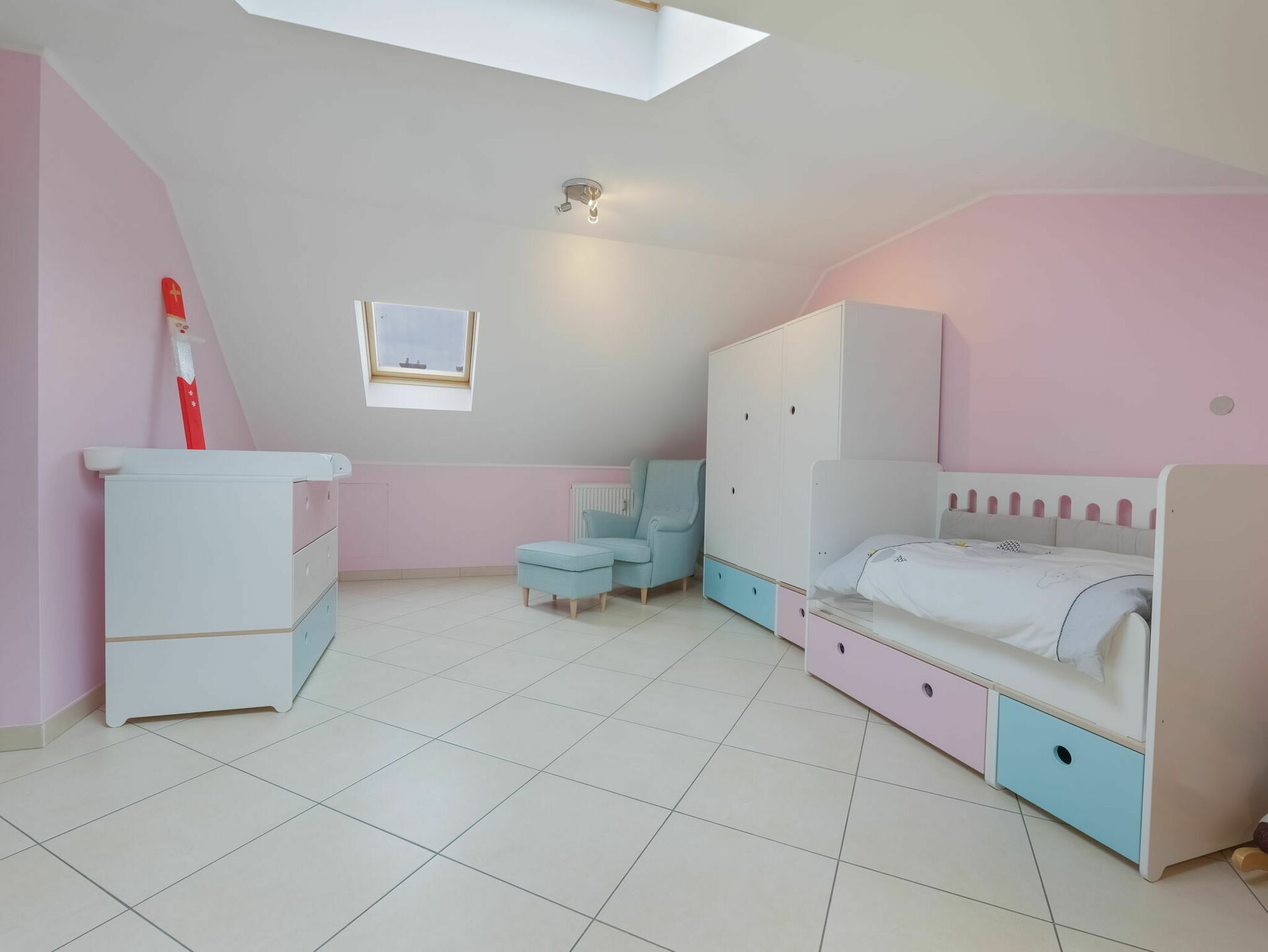 - Une seconde grande chambre mansardée avec effet cathédrale de +/-13m2 (+/-28m2 au sol)