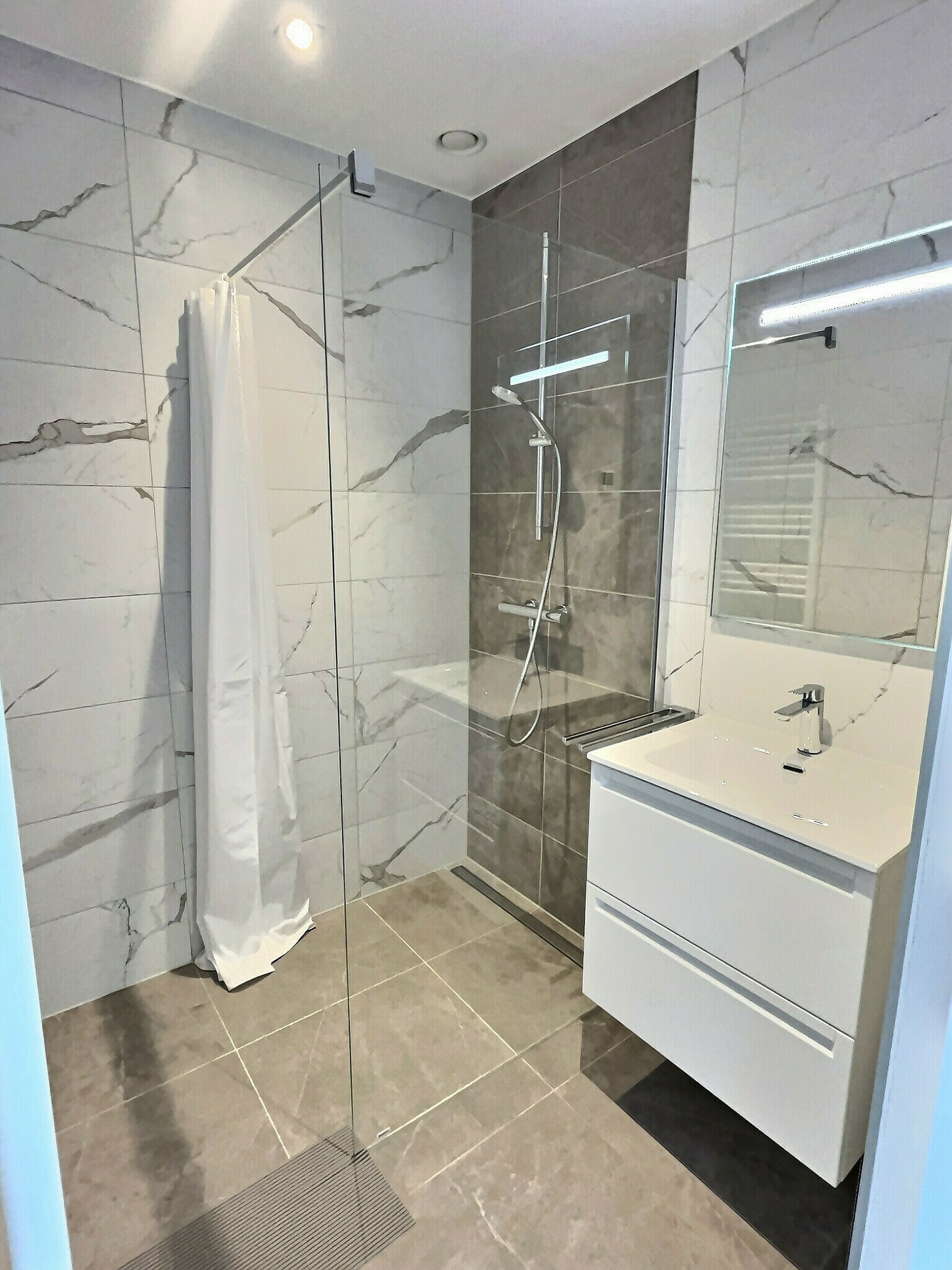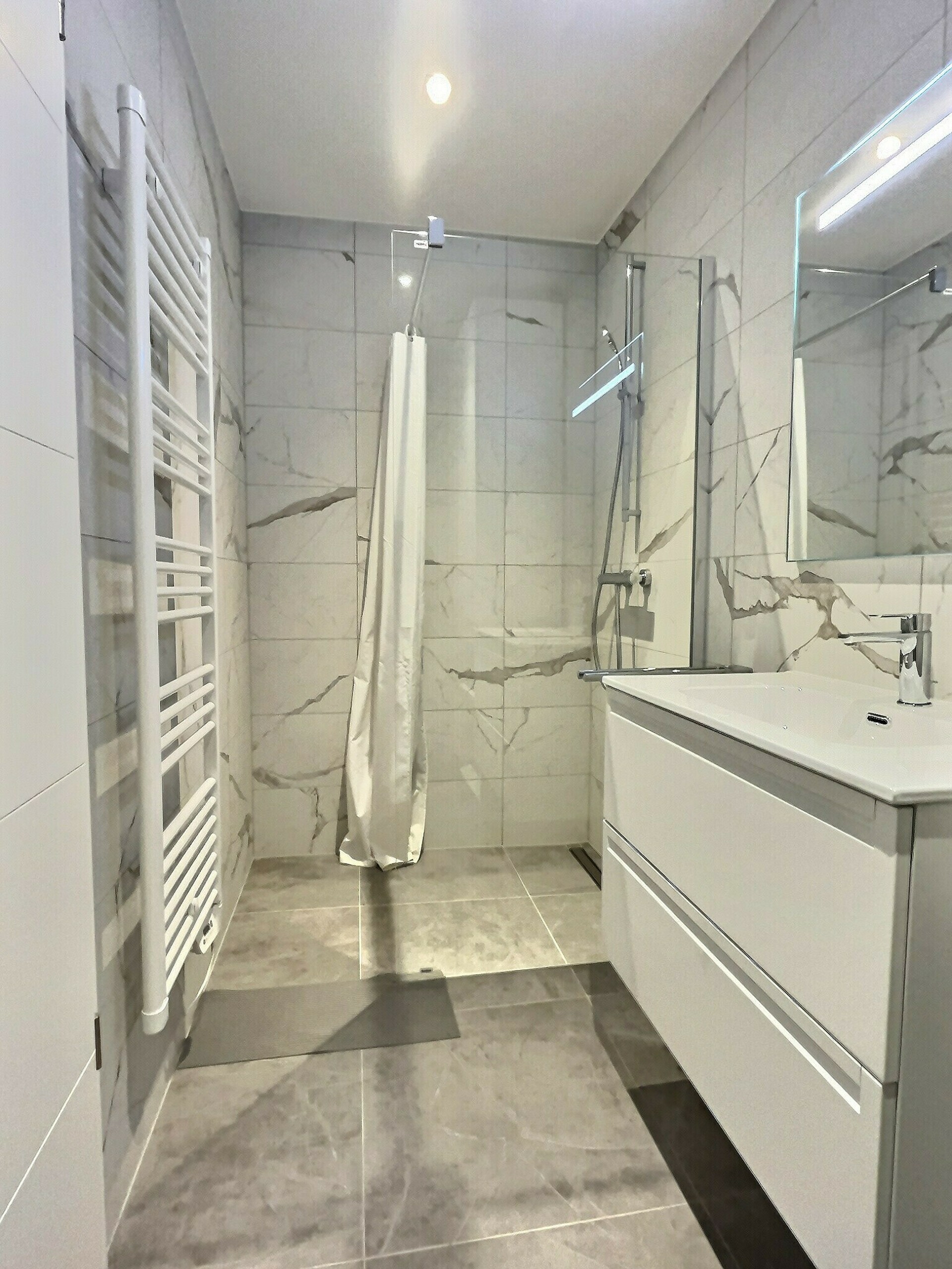 - Un hall d'entrée (+/-4,35m2) et d'un couloir (+/-4m2) - Un WC séparé (+/-2,60m2) - Une salle de bain (+/-5m2) - Un espace de vie spacieux de +/-27m2 avec cuisine ouverte et totalement équipée - Une chambre parentale (+/-15m2) et sa salle de bain (+/-3,30m2) - Une seconde chambre (+/-14m2)