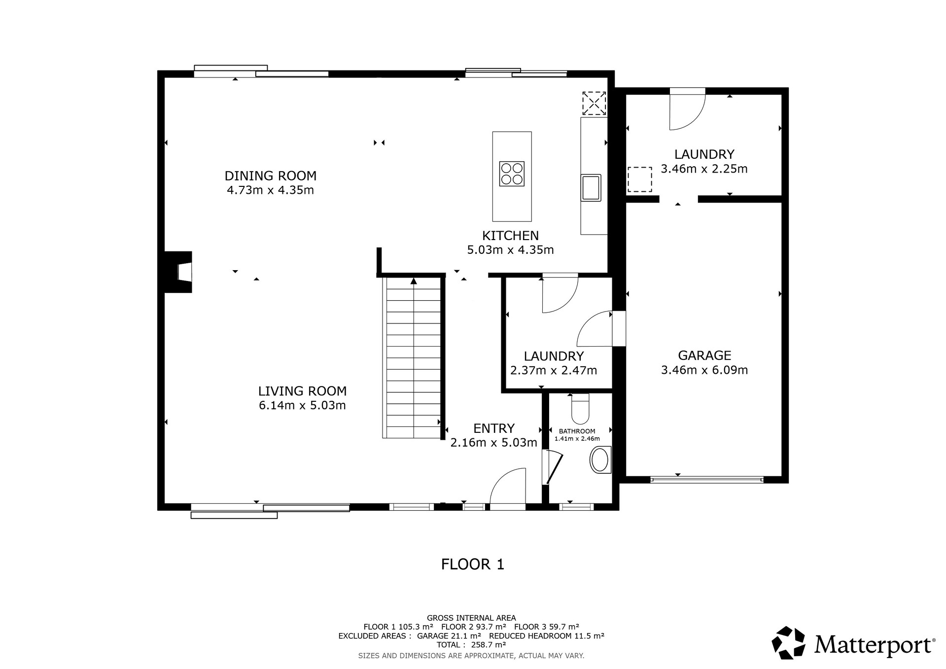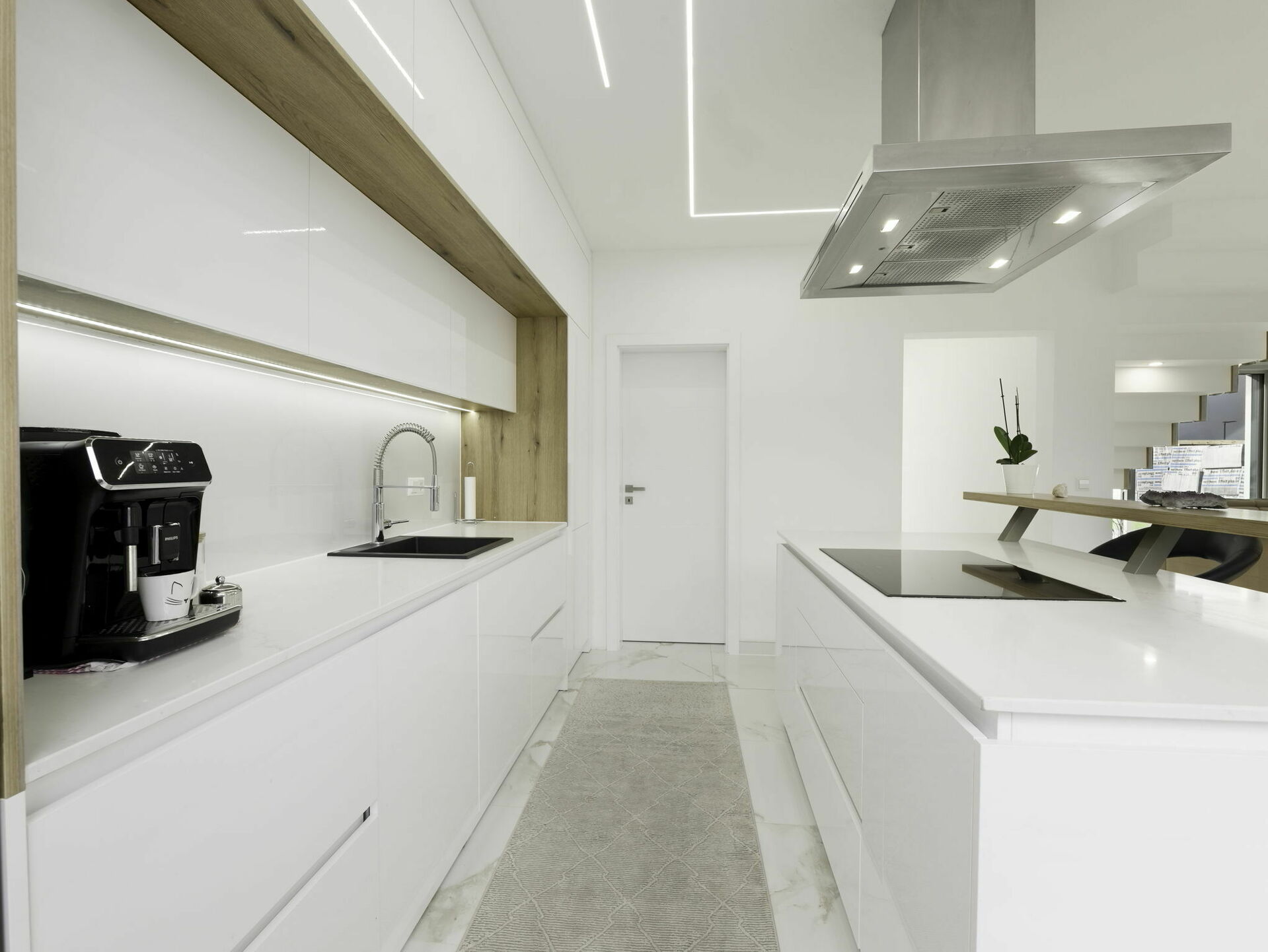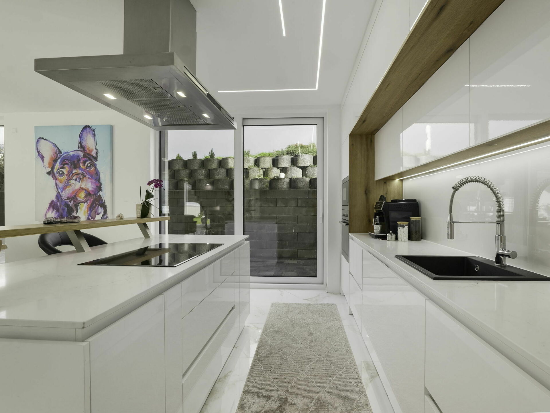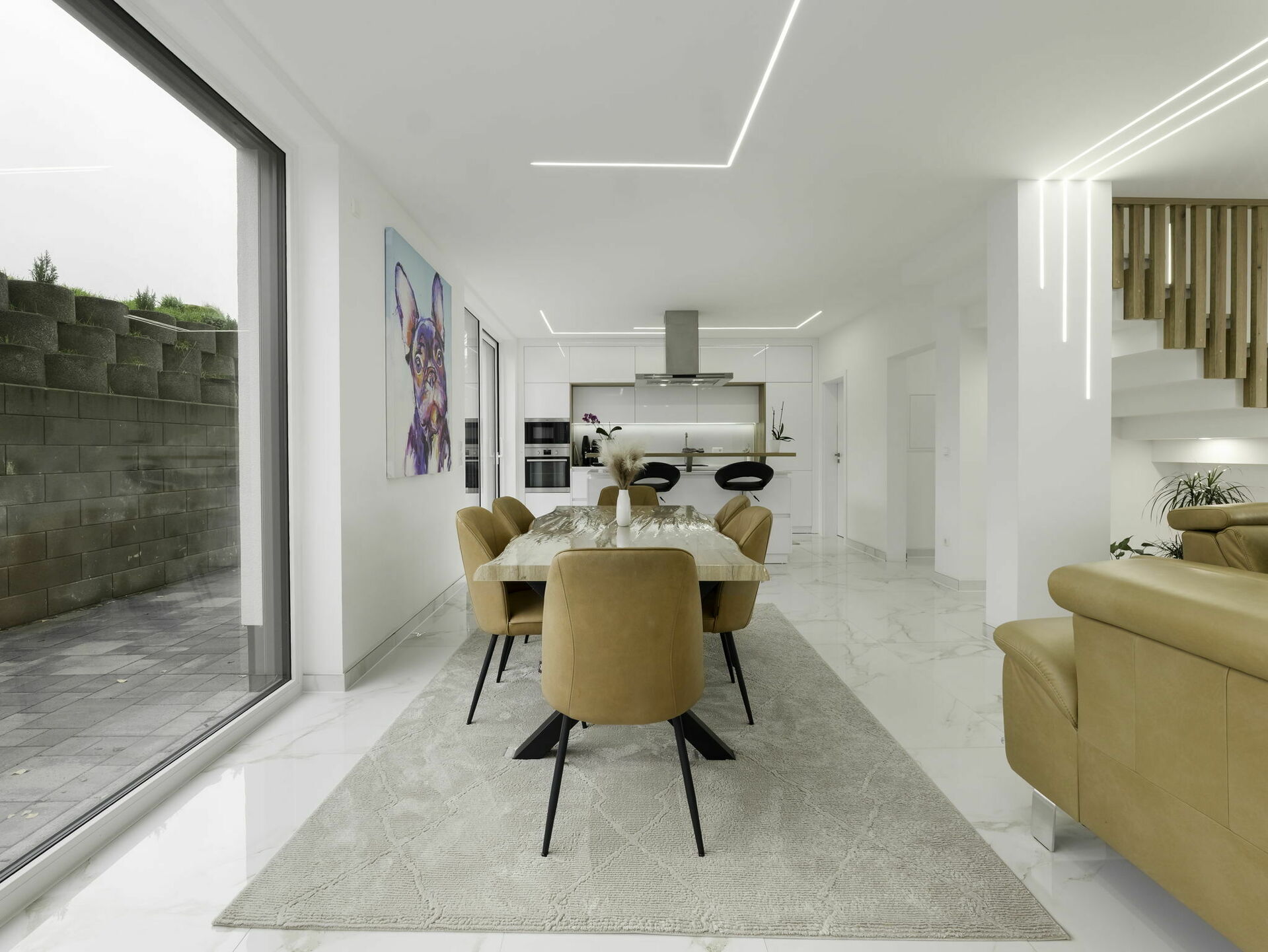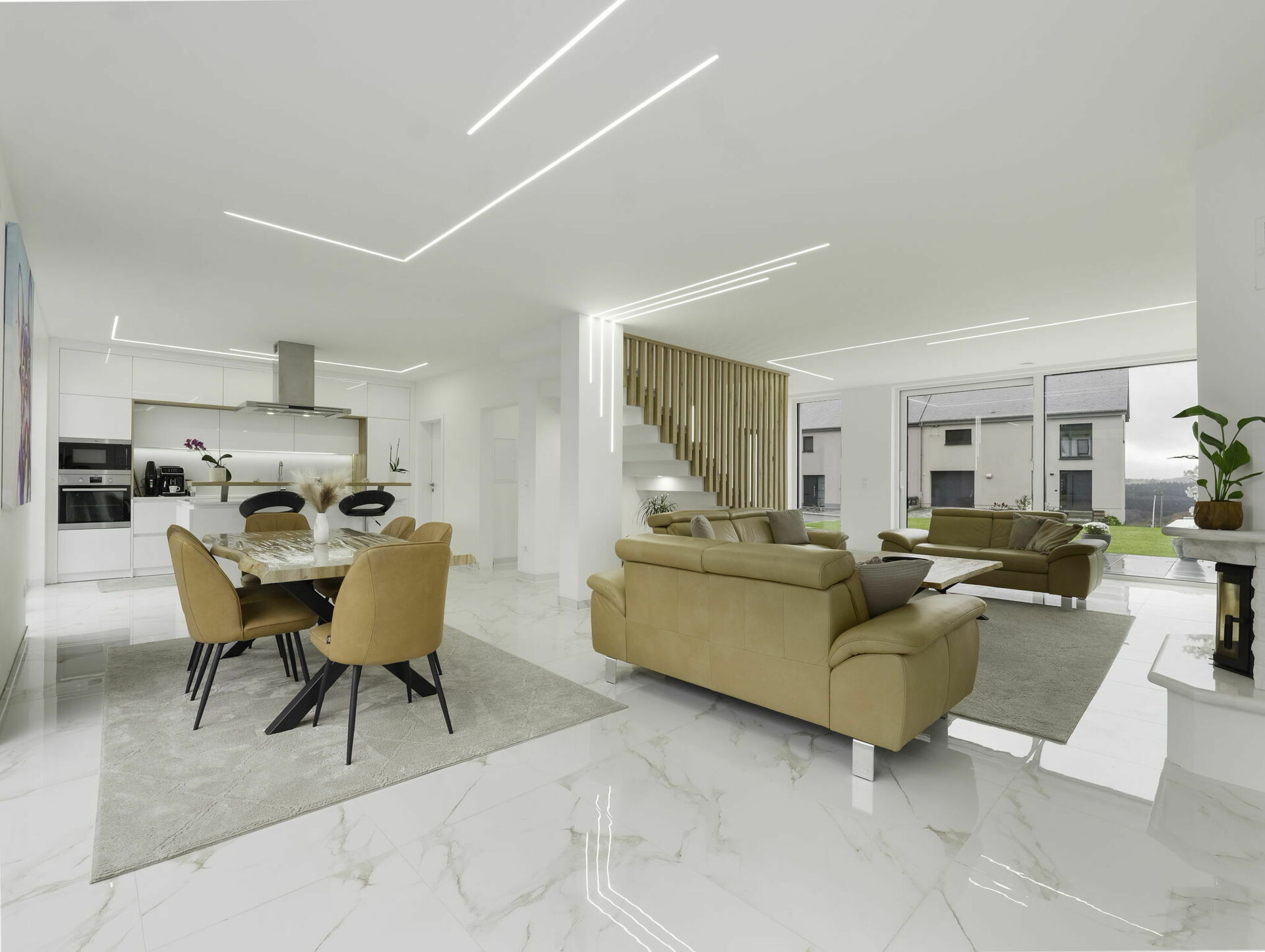 - Cuisine ouverte avec îlot central (± 5,03 m x 4,35 m) et espace salle à manger
