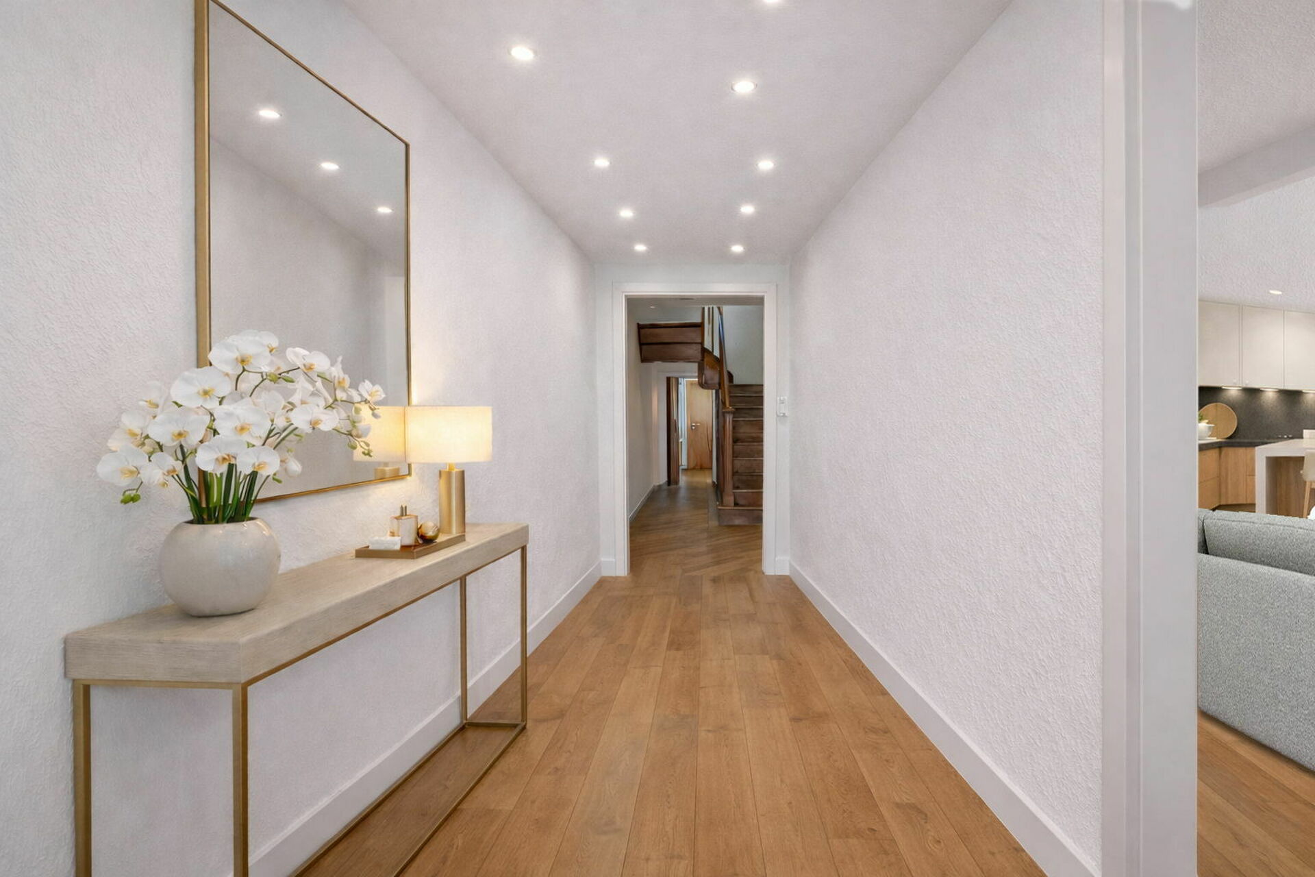Depuis le couloir du rez-de-chaussée, vous bénéficiez d'un accès direct à la terrasse et au jardin, un espace extérieur qui peut être encore valorisé en créant une connexion fluide avec la cuisine, idéal pour des petits-déjeuners ensoleillés ou des soirées de détente.