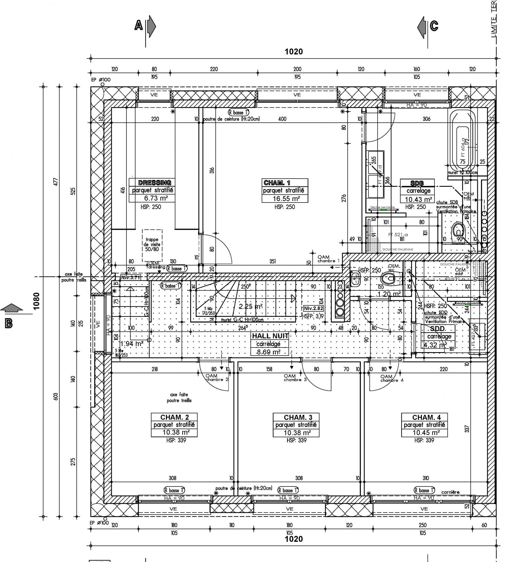 Etage +1 : un hall de nuit, 4 chambres à coucher dont une avec un dressing et une salle de douche, un WC séparé et une salle de bains.