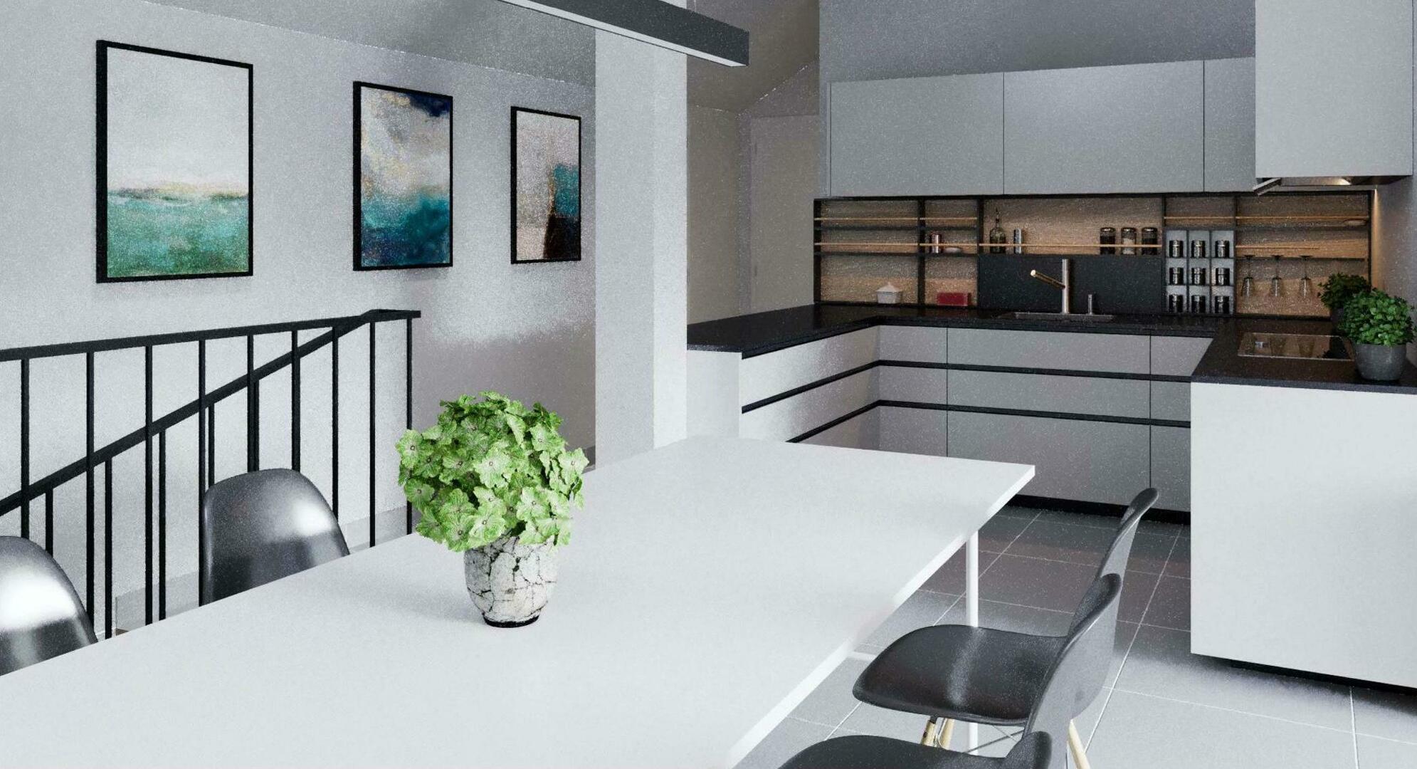 Un grand espace open space lumineux (séjour + cuisine) avec accès à une spacieuse terrasse