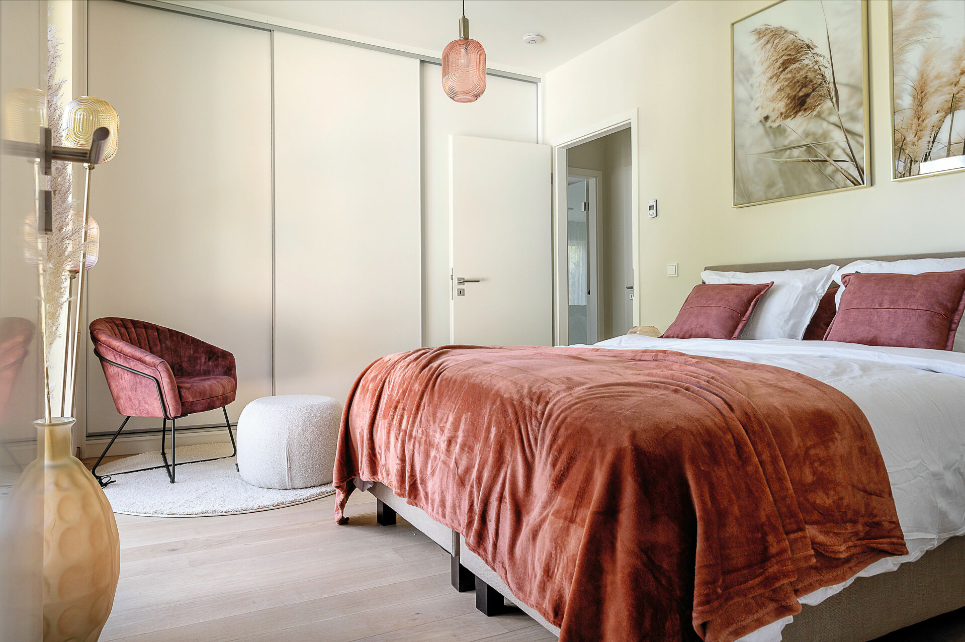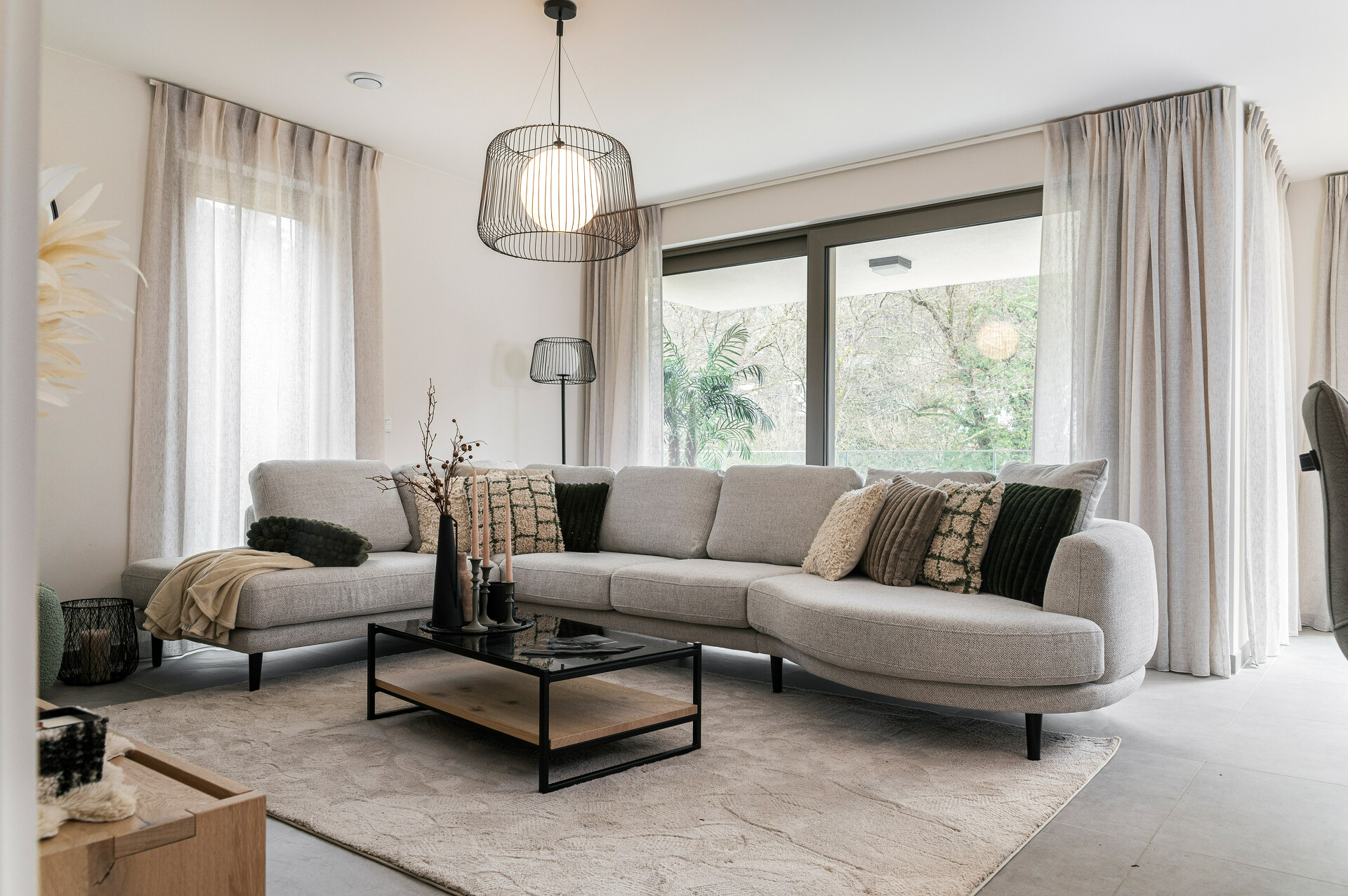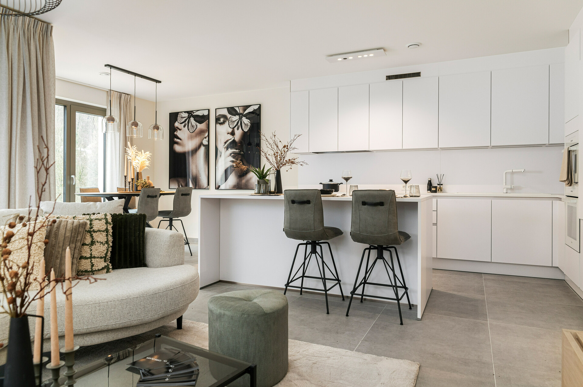 Second floor: - A master suite (+/-16m2), plus dressing room (+/-8m2) and bathroom (+/-7.50m2) - Separate WC (+/-1.80m2) - Utility/laundry room (+/-8m2) - Large living room with kitchen (+/-54m2) opening onto terrace - Large terrace (+/-34m2)