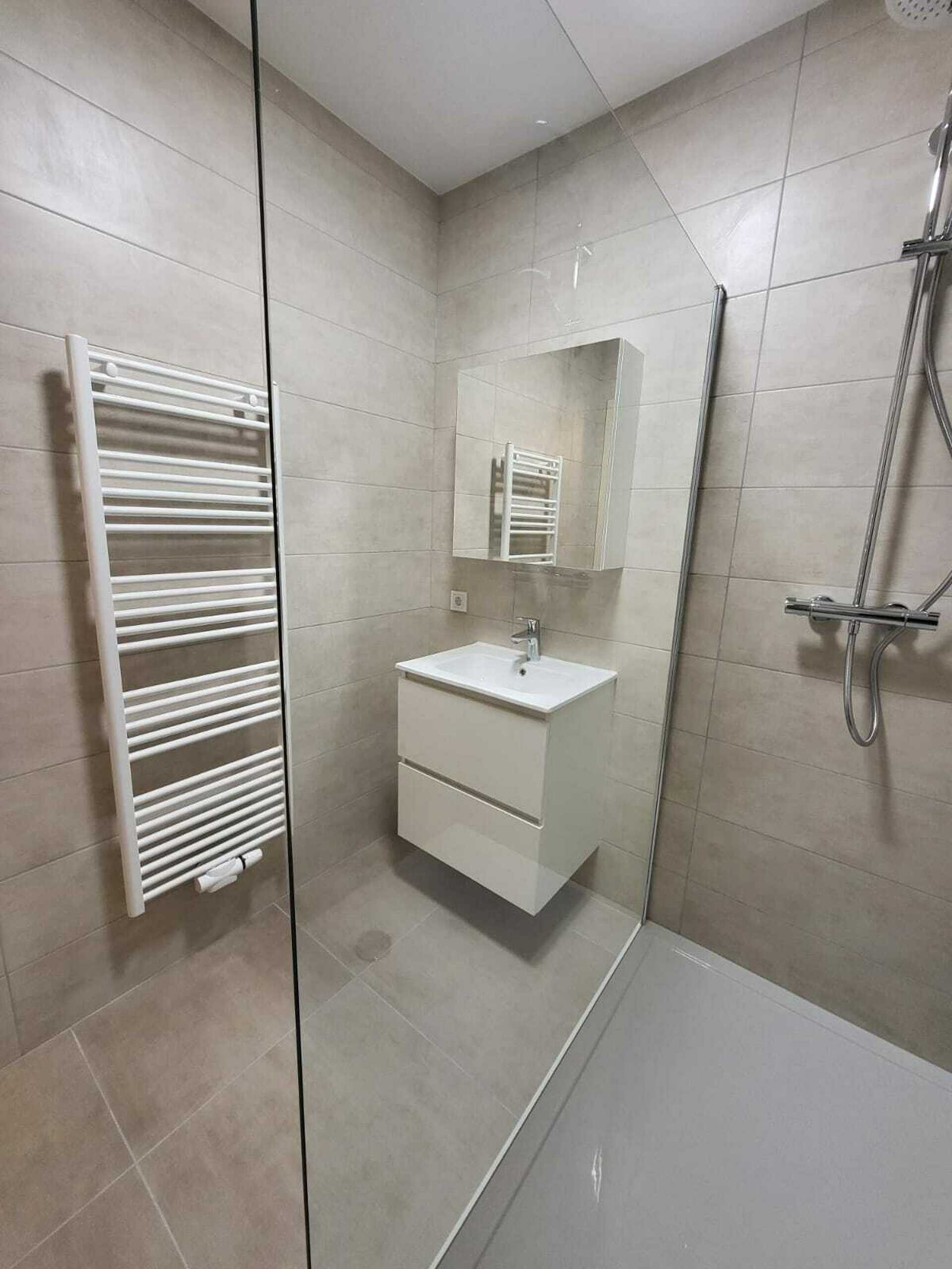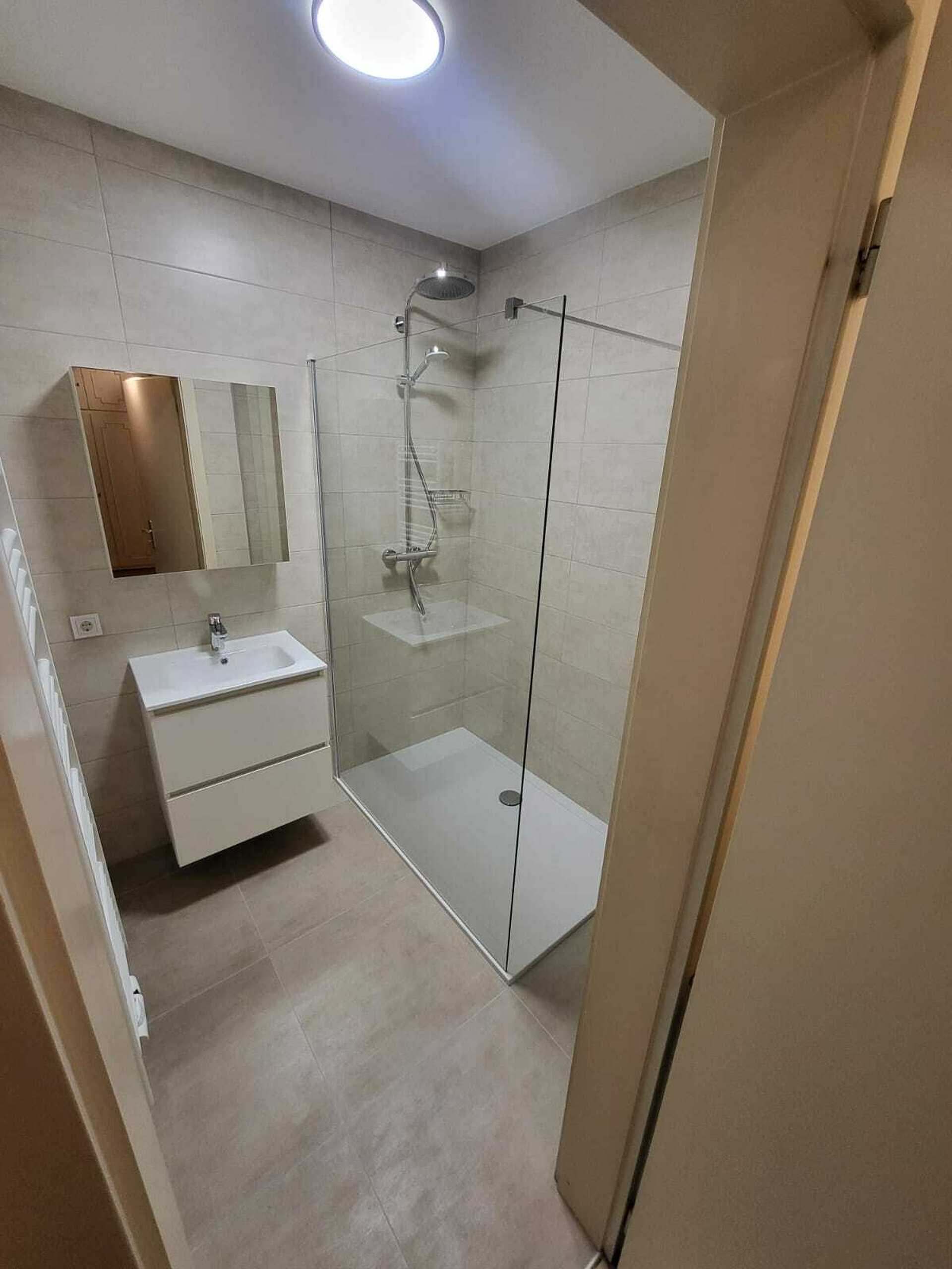 Une salle de douche neuve et WC séparés.