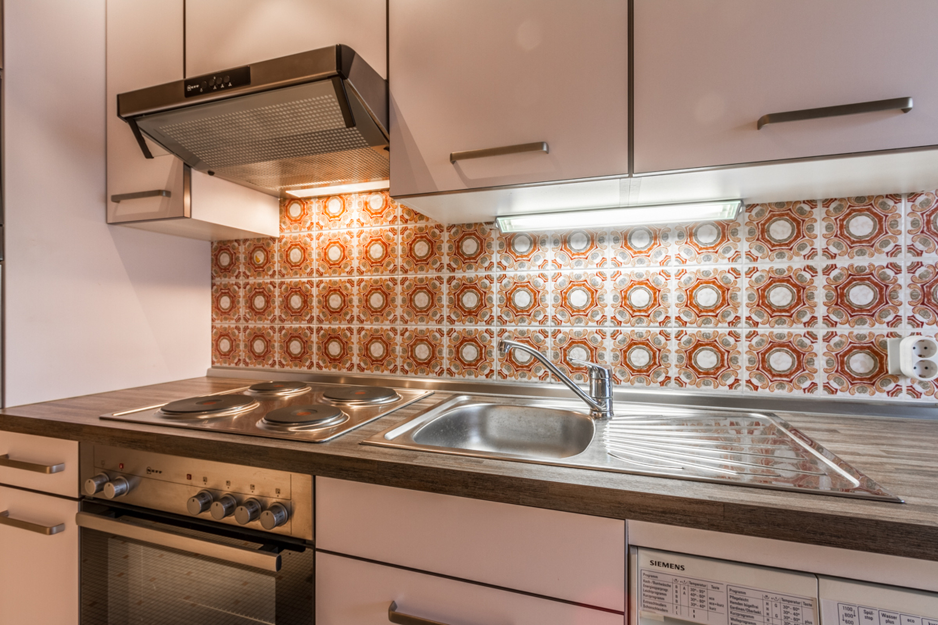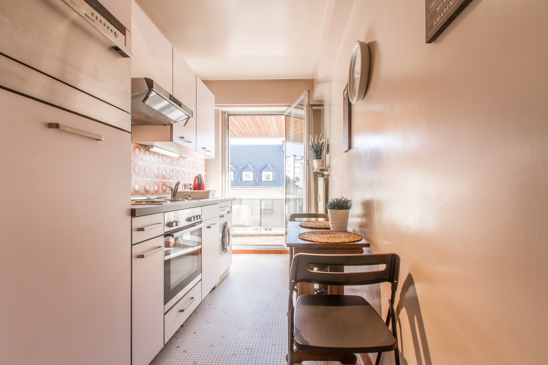 Une cuisine entièrement équipée et une machine à laver le linge.