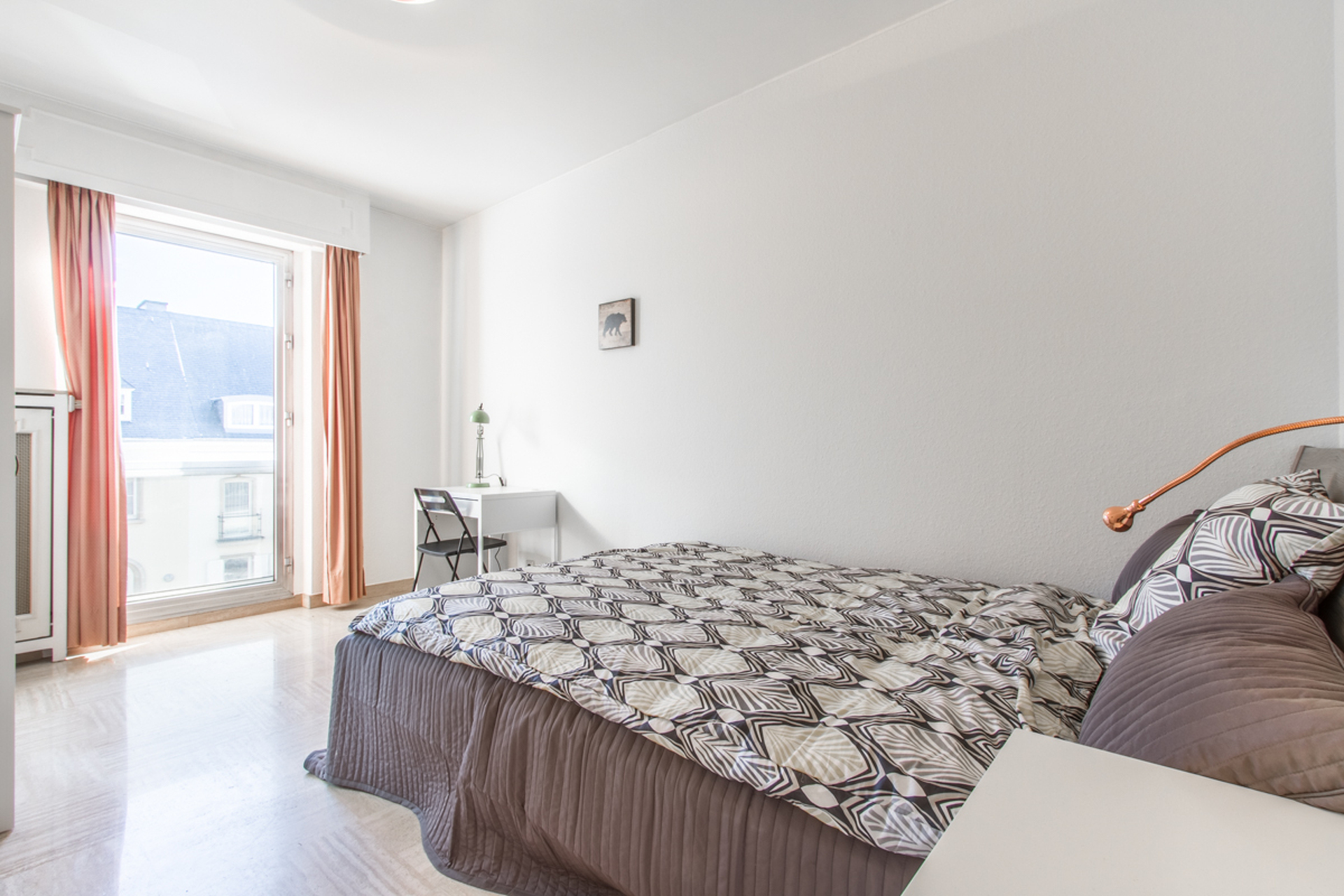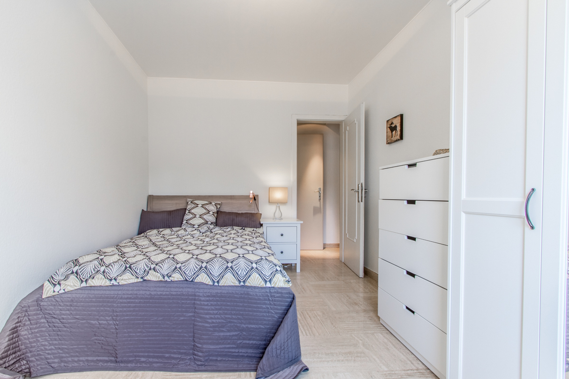 D'une chambre avec un lit double (140cm x 200cm), une table de nuit, un dressing et un bureau